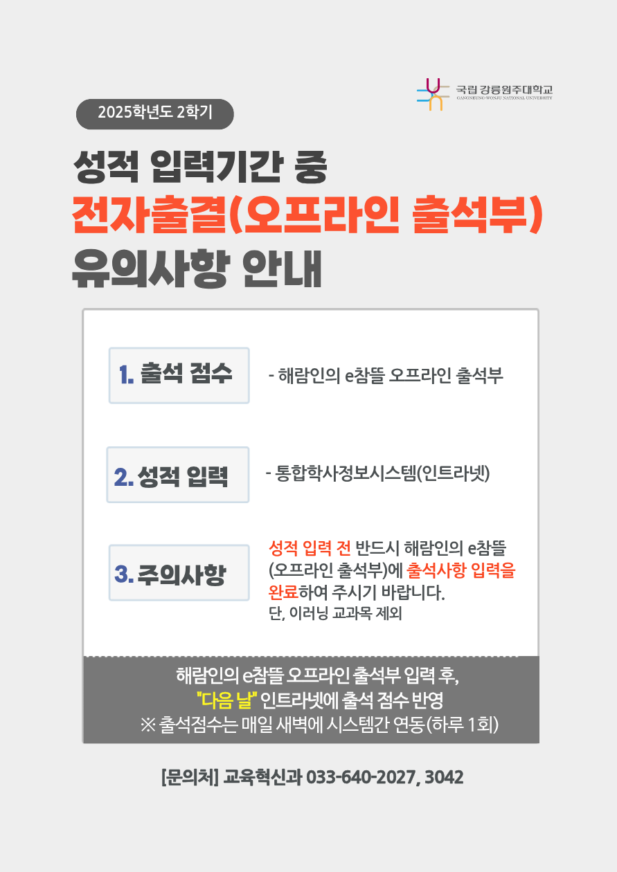 [필독] 성적입력 기간 중 오프라인출석부 유의사항 안내